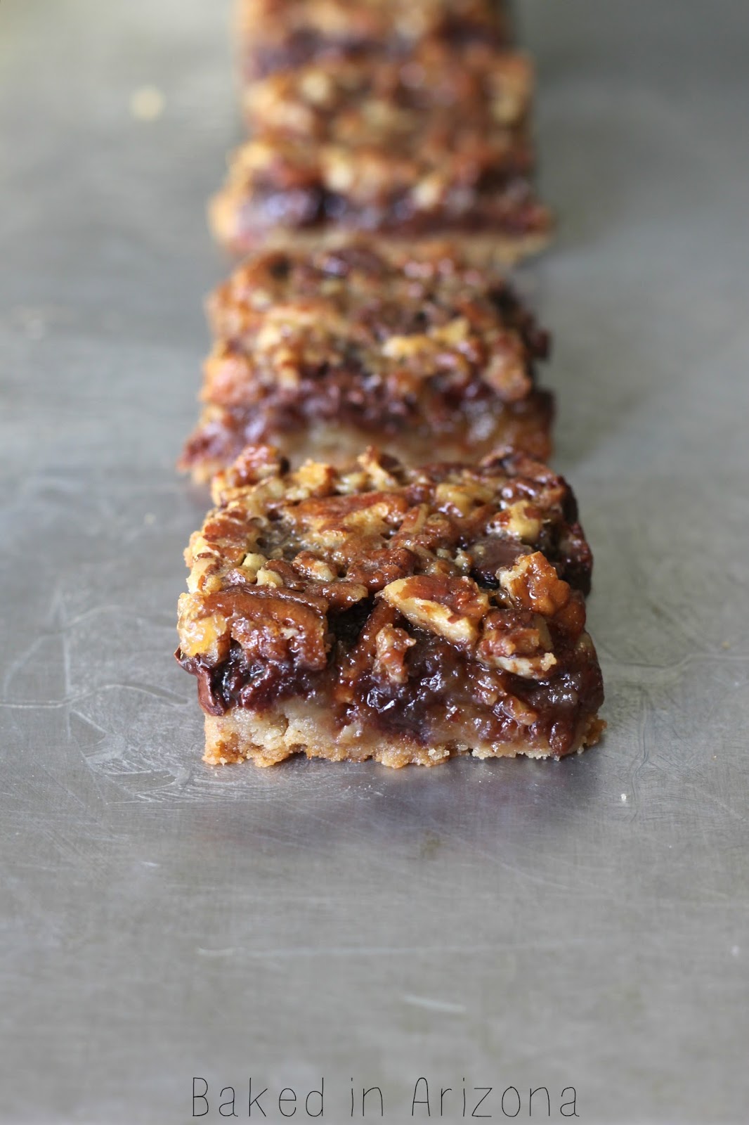 I think bars are fun for lots of different reasons. 1. It’s a nice change from the traditional pie and I am all about change! 2. You can cut them into big or little pieces depending on your needs. You could even take half the pan to one party, and half the pan to another, and nobody would know. Try taking half a pie to a party?! Weird looks for sure. 3. Kids seem to be more excited about these than regular ‘ole pecan pie (maybe it’s the chocolate? maybe it’s the bar? but either way, they will be a hit with all ages. My cute little nephews loved them! 4. And last, these bars are really easy to make. So if you are not confident with your crust making skills or just don’t want to fuss with it, make these bars. Nobody has to know how easy they were. Bars are the new pie. hehe. Well at least right now they are!