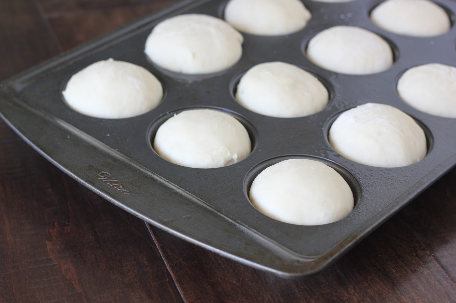 Place the dough onto a floured surface. Knead for a few minutes. Grab pieces of dough with your pointer finger and thumb then pinch off. Tuck the dough under to form a nice round top. Place in muffin tin. Cover and let rise for 15 more minutes. While they are rising, preheat your oven to 400 degrees. Brush the tops with butter then bake for 10 minutes.